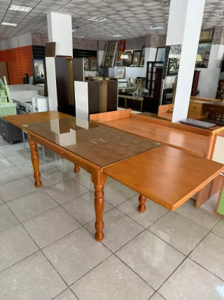 Elegante mesa de comedor con un diseño ovalado que combina la calidez de la madera con la transparencia del cristal. - Base robusta de madera con detalles tallados. - Superficie de cristal pulido y brillante. - Borde de madera pulida.extensible el doble que lo que es,solo el cristal ya vale más que el precio de la mesa