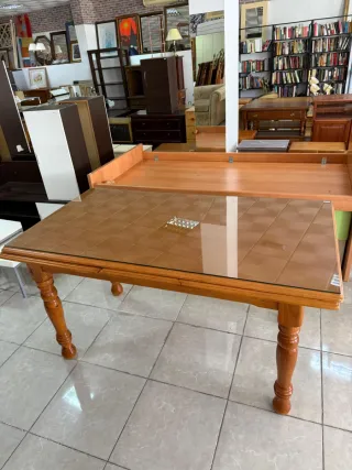 Mesa de comedor con un diseño clásico y funcional, perfecta para ampliar el espacio cuando sea necesario. - Fabricada en madera resistente. - Superficie de cristal. - Mecanismo de extensión para mayor capacidad. Mesa de madera extensible Cerrada largo 147 x 80 Abierta 263 cm Precio 150€