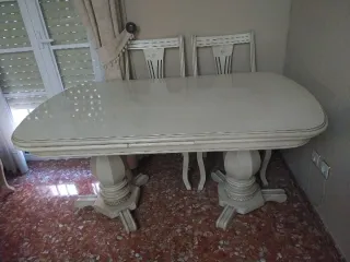 Mesa extensible(2'18cm) con 4 sillas,el tablero y una silla tienen unos pequeños desperfectos que se aprecian en la foto