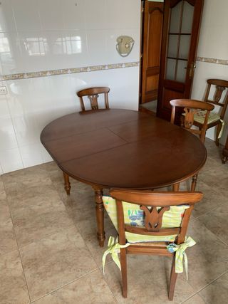 Conjunto de mesa y 6 sillas. La mesa mide 2 m y es extensible por ambas partes hasta 3 m. Si interesa tengo a juego la mesa de sofá y el mueble del salón (consultar precio de estas 2 cosas a mayores).