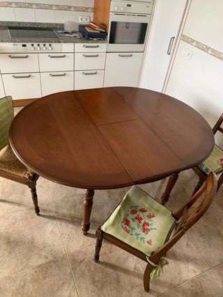 Mesa de comedor de madera extensible. La mesa está en buen estado, con algunas señales normales de uso. - Mesa redonda. - Estilo clásico. - Defecto en canto de la mesa, falta sobre 15cm del canto (ver foto). - Diametro mesa 1'10 mt, extensible 40cm mas. - Se puede desmontar patas de la mesa, para mejor transporte.