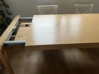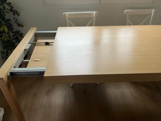 Mesa de comedor de Ikea, ideal para espacios reducidos o para ampliar cuando sea necesario. - Diseño moderno y funcional. - Acabado en madera clara. - Patas de madera resistentes.