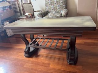 Mesa de centro extensible a mesa de comedor. Madera maciza. Medidas en las fotos. Solo desgastadas las tapas, resto impoluto. Mecanismo de abrir y cerrar excelente.