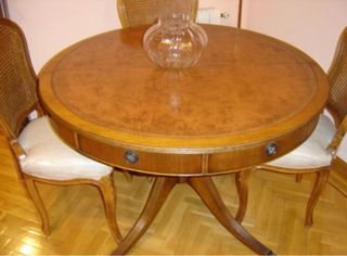 Elegante mesa de comedor con un diseño clásico. Perfecta para reuniones familiares o cenas especiales. - Diametro de 105cm. Cerrada hasta cuatro comensales y abierta con dos piezas centrales se convierte en una mesa de unos 150cm de ancho para 8 personas La madera tiene alguna marca que se ve en la foto - Acabado en madera oscura. - Detalle de cajón con tirador metálico. - Patas de madera tallada.