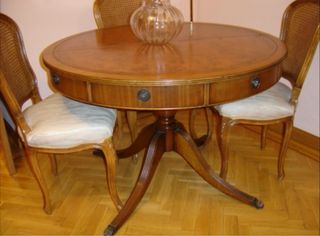 Elegante mesa redonda de estilo francés, antigua, con un diseño clásico y sofisticado con tapizado en cuero - Tablero con incrustaciones de cuero. - Patas de madera tallada y adornos de metal - tiradores decorativos - medidas 107cms de diámetro, extensible a 151 cms y 195 cms.