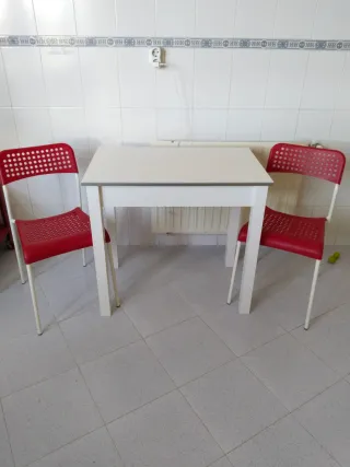 Mesa de 90 cm extensible. En muy buen estado con las patas de aluminio. De excelente calidad. Las cuatro silla se regalan