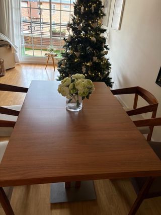 Mesa de comedor extensible (es de exterior pero la hemos usado como interior). Madera de acacia indiana maciza, acabado rústico y envejecido a base de nitrocelulosa. Súper resistente. Como nueva. Tiene dos piezas extensibles que no se guardan en la propia mesa, van aparte, aunque son muy fáciles de poner. La vendemos ya que necesitamos una más grande por aumento de la familia. Para 6 - 8 comensales. * Comprada en Westwing en 2021. * Dimensiones: normal 120 x 90 cm, con extensiones 200 x 90 cm, alto 77 cm. * Recogida en mano en Boadilla del Monte.