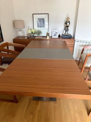 Vendo conjunto de comedor completo de madera maciza (alta calidad y gran durabilidad) extensible. cerrada: 6 comensales. abiertas las alas laterales: hasta 12. Incluye mesa rectangular robusta y 6 sillas a juego con respaldo en "X" y tapizado claro. Perfecto para uso diario y reuniones. La estructura es muy firme. El barniz de la tapa tiene algunas marcas de uso normales (ver fotos), que se puede lijar sin problema, pero es un mueble para toda la vida. Medidas Largo 150 cm y abiertas las extensiones 250cm | Ancho: 90 cm| Alto: 77cm