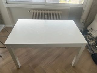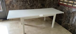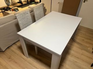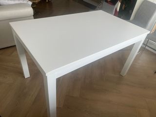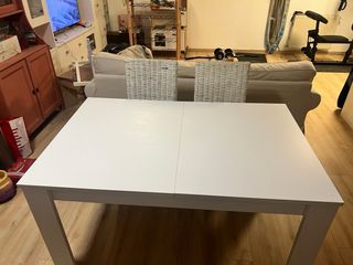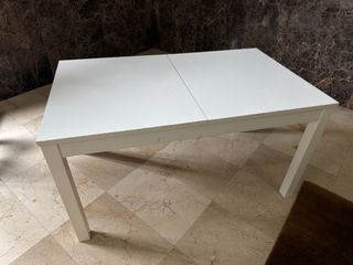 Mesa de comedor extensible de IKEA modelo Laneberg. Es de madera maciza, en blanco. La parte extensible se guarda bajo el tablero. Ver dimensiones en foto. Esta como nueva, y la parte extensible a penas se ha utilizado 5 veces. Se puede entregar montada o desmontada. Com