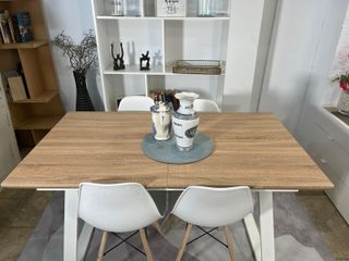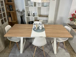 680*558*196 ☎️ Mesa: 75€ Mesa 4 sillas: 131€ Mesa de comedor nueva a estrenar, moderna y funcional, en acabado madera roble claro. Perfecta para hogares que necesitan ahorrar espacio sin renunciar a estilo. Es extensible, por lo que puedes usarla cerrada para el día a día o abrirla para recibir a invitados. Muy estable y de excelente calidad. 📏 Medidas: Largo: 67cm (cerrado) y 134 cm (abierto) Ancho: 67 cm Alto: 78 cm