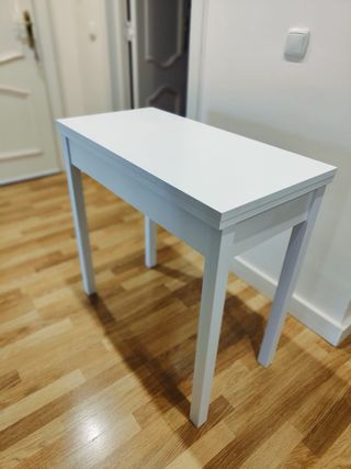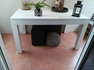 Robusta mesa de comedor extensible de Ikea, modelo Bjursta,con muy escaso uso. Tiene dos paneles que se guardan bajo el tablero principal. I Largo de 140/180/220cm Precio original 169e. - Acabado en blanco. - Fabricada en madera. Presenta mínimo defecto estetico en la parte inferior de las patas, se adjunta foto. Se vende por mudanza