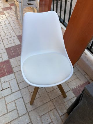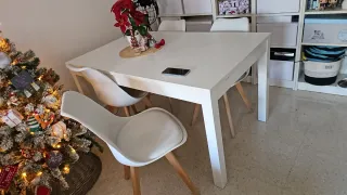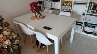 Conjunto de mesa extensible y cuatro sillas. - Mesa de madera de ikea con diseño moderno. - Sillas blancas nórdicas con patas de madera y cojin de polipiel. Estructura de madera. Acabado en color blanco. Extensible de 140cm a 220cm, 74 alto, 84 ancho. Buen estado de la mesa. El cojín de las sillas tienen algunos recuerdos que han dejado mis gatitos, pero nada que no se pueda arreglar con un tapizado fácil.