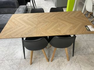 Llama ya! 📞24/7 📍 632*24*70*00 📞 📦 ENVIOS A TODA ESPAÑA 🌍 🛋️ MUEBLES NUEVOS DE TODO TIPO PARA EL HOGAR 🏠 🎁 NUEVOS EN SU CAJA DE FABRICA 📦 🔒 CON GARANTÍA DE FABRICA DE 2 AÑOS 🔒 1️⃣ Se suben hasta el domicilio 🚚🏠 2️⃣ El pago es en persona al recibir 💵📲 3️⃣ Pago en efectivo 💸 Conjunto de mesa de comedor con un diseño moderno y cuatro sillas. - Mesa con tablero de madera con patrón de espiga. - Patas de la mesa de metal negro. - Sillas de diseño ergonómico en color negro.