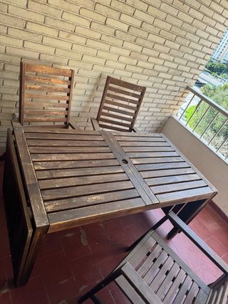 Conjunto de mesa y sillas de madera para exterior. Ideal para disfrutar de momentos al aire libre. - Mesa con diseño de listones. - 2 Sillas plegables y 2 rígidas - Mesa extensible medidas 77 ancho 140 sin abrir Abierta 260