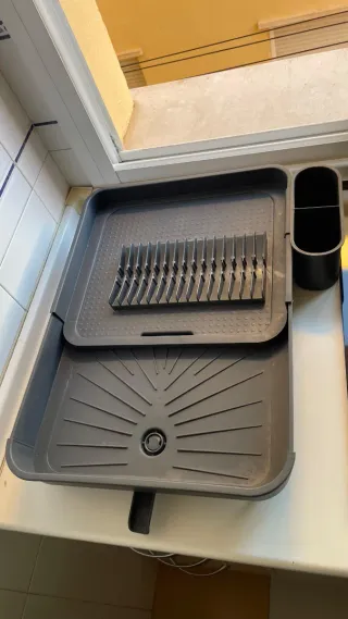 Escurreplatos gris de plástico extensible como nuevo, con menos de un mes de uso. Tamaño cerrado: 32 cm ancho x 15 cm alto x 36 cm profundo Tamaño extendido: 51 cm ancho x 15 cm alto x 36 cm profundo