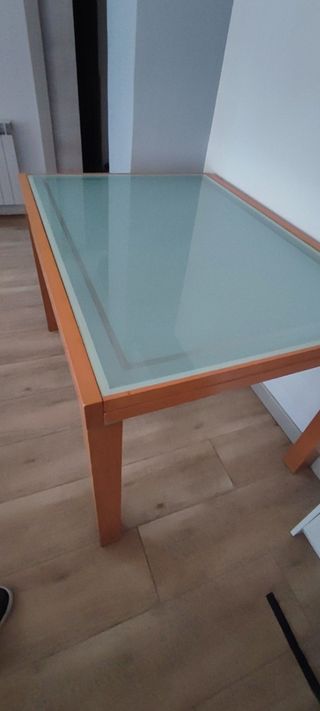 Mesa extensible con un diseño moderno que combina madera y vidrio. Una vez abierta pasa de 117 cm a 234 cm. Se encuentra en muy buen estado. Sin golpes ni arañazos. Se entrega desmontada y con la llave necesaria para montarla. - Tablero de vidrio con detalles en los bordes. - Estructura de madera resistente. - Extensible para mayor capacidad. - Acabado en madera natural. - Superficie de vidrio transparente.