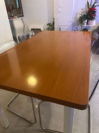 Elegante mesa de comedor de madera y extensible, gana medio metro más. - Diseño moderno y funcional. Se vende sin adornos. Los desperfectos se muestran en foto.