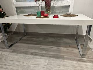 Elegante mesa de comedor con acabado lacado en blanco y patas de acero. - Diseño moderno y minimalista. - Superficie lisa y fácil de limpiar. - Patas robustas de acero. - medidas as 1,80x90 extensible a 2,30 - Con cajón para cubertería amplio.