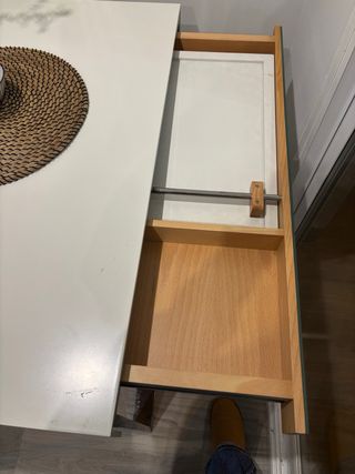 Mesa extensible con un diseño moderno y funcional. - El cajón está deteriorado como se puede ver en la foto. - Tablero de madera extensible de 79cm a 118cm. - Patas de metal plateado.