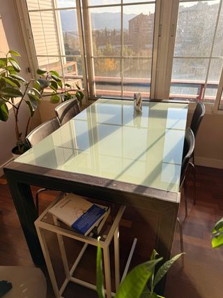 Mesa de cocina extensible de cristal. Está en buen estado. En las fotos se pueden apreciar unas micro rayas en el cristal y un pequeño inchado en la parte que no es de cristal. Medidas: Cerrada: 90 de largo y 45 de ancho. Abierta: 90 de largo y 80 de ancho. Distancia entre patas por dentro 80cm Altura 76 cm Solo entrega en mano en murcia capital.