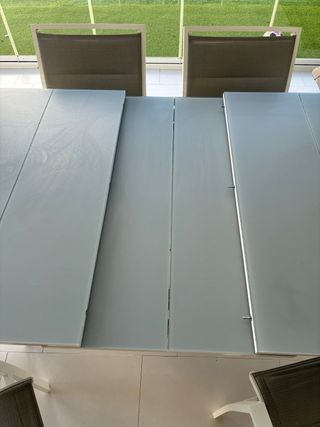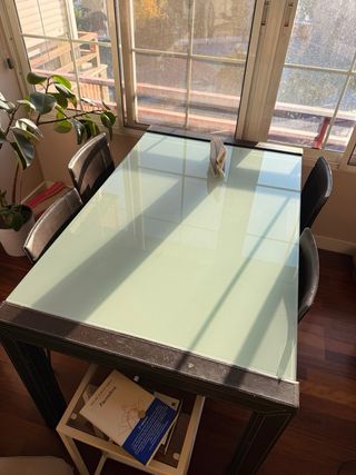 Mesa de comedor vidrio templado extensible, muy robusta, diseño moderno - Tablero de vidrio templado - Estructura, armazón y patas de acero, cromado - Extensible de 125/188x85 cms para mayor capacidad. El tablero de vidrio deja pasar la luz y da a la mesa un aspecto armonioso y ligero, incluso en espacos pequeños La mesa riene capacidad para 8 ó 10 comensales Tiene algunos rasguños muy leves que apenas se aprecian y no afectan a la estabilidad ni uso de la mesa #mesacristal #mesacristaltransparente #mesacomedor #mesacocina #mesaextensible #mesaacero #mesaaceroinoxidable #mesarectangular #mesa125 #mesaresistente