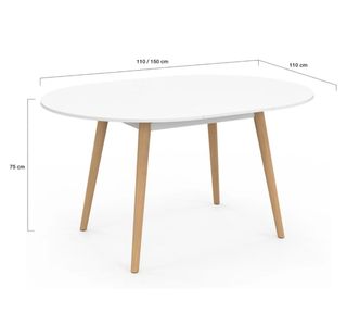 Mesa de comedor ovalada, solo montada y sin usar. Su diseño moderno combina una superficie blanca con patas de madera. - Medidas: 110/150 cm de largo x 110 cm de ancho x 75 cm de alto.