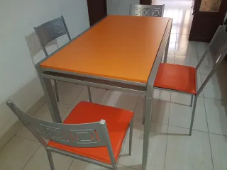 Conjunto de mesa de cocina extensible con cuatro sillas. - Mesa con sobre naranja y estructura plateada. - Sillas con asiento naranja y estructura plateada. -Medida mesa cerrada 1,20 a 1,70 extendida