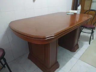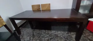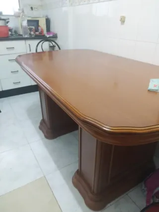 Mesa de madera con un diseño elegante y funcional. - Superficie extensible para mayor espacio. - Acabado pulido y brillante. Las medidas son: -1.65m de largo por 90cm de ancho -La parte extensible le añade 0.35cm más - De normal caben unas 8 personas y al abrir la parte extensible pues hasta 12 aproximadamente -Tiene algunas manchas y en algunas zonas está rayada