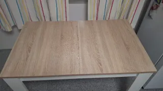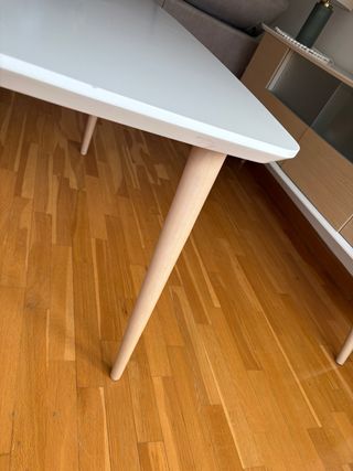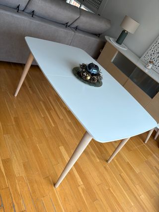 Mesa de comedor extensible estilo nórdico. - Tablero de madera con acabado en tono natural. - Patas y estructura en color blanco. Medida cerrada: 123cmx75cm (6 personas) Abierta: 174cmx74cm (8 personas) Tiene un poco de desgaste en el centro. Por lo demás está perfecta
