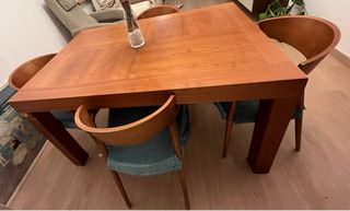 Mesa de comedor de madera con un diseño elegante y funcional. Sus alas extensibles permiten adaptarla a diferentes necesidades. - Estructura de madera maciza. - Tapicería de las sillas en tela color teal. Pequeño roce en las patas en la mudanza, por eso el precio. Posibilidad de cambiar patas. Vendo por tamaño demasiado grande en el nuevo piso.