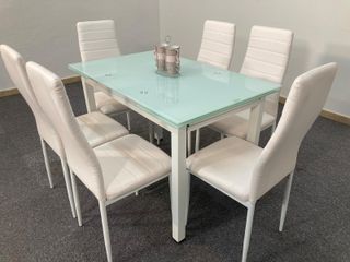 Conjunto de mesa de comedor extensible con seis sillas. - Mesa con superficie de cristal. - Patas de metal. - Sillas tapizadas en blanco. Linea directa📞24/7 sin compromiso! 📍 643*189*083 📞 🛋️ MUEBLES NUEVOS DE TODO TIPO PARA EL HOGAR 🏠 🎁 NUEVOS EN SU CAJA DE FABRICA 📦 1️⃣ Se suben hasta el domicilio 🚚🏠 2️⃣ El pago es en persona al recibir 💵📲