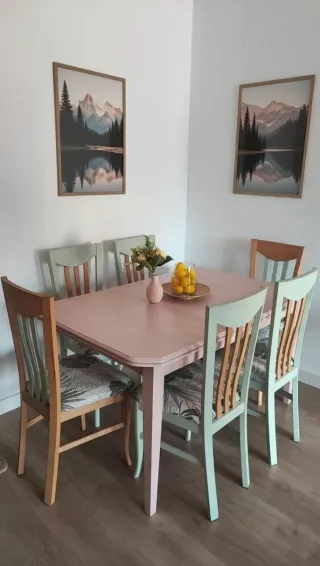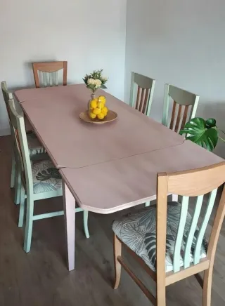 Conjunto de mesa extensible con 6 sillas. Medidas: • Mesa: 140*90cm y 217cm extendida. Alto 75cm. • Sillas: 48cm hasta asiento. Y 98cm incluyendo respaldo. - Mesa en color rosa palo. - Sillas con estructura de madera y asientos tapizados con estampado de hojas. - Sillas en tonos verde menta y madera natural. Tanto la mesa como las sillas están decapadas y pintadas con pintura a la tiza.