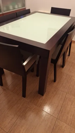 Conjunto de mesa de comedor con superficie de cristal y sillas a juego. - Diseño moderno y elegante. - Estructura de madera resistente. - Tablero de cristal fácil de limpiar. Color wengue 4 sillas 2 sillones Todo en estado impecable Medidas 1.35 Extensible a 2.25