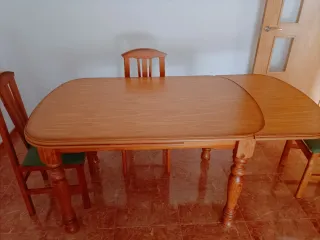 Mesa de madera redonda extensible y cinco sillas a juego (una ya no está disponible). Necesario desmontarla. Pequeño desperfecto de aproximadamente 1 cm (adjunto foto)