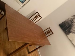 A RECOGER en OVIEDO. Ya están desmontadas las patas para que se pueda llevar fácilmente en coche o furgoneta. Ver las fotos hay unos rayones del uso en un lado solo. Conjunto de mesa extensible con cajón, ideal para espacios versátiles. Incluye cuatro asientos. - Mesa de madera con extensión. - Cajón integrado. - Dos sillas de madera. - Dos taburetes de madera.