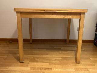 Mesa extensible en perfecto estado de IKEA. Se gira la parte superior y dobla su longitud. La estructura de patas queda en el centro una vez extendida. Color madre claro. 90 / 130 de ancho una vez extendida.