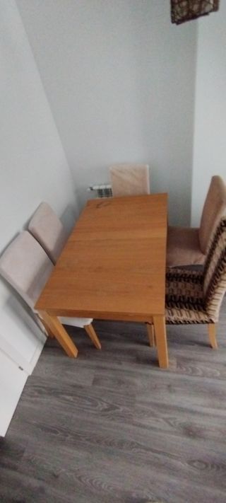 Conjunto de mesa de comedor y sillas. Medidas: - 90 cm ancho - 76 cm alto - 169 cm largo extensible hasta 205 cm Mesa de conforama y sillas de Ikea. En perfecto estado. Fácilmente extensible y cómoda para varios comensales. Mesa y sillas desmontables para poder transportarla con mayor facilidad. Si estás interesado solo en la mesa escríbeme para hablarlo. No se hacen envíos