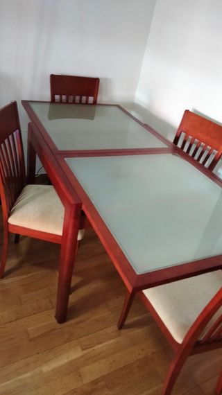 Mesa de comedor extensible de madera y cristal en buen estado, medidas de ancho 86 cm, de largo cerradas 1,45 cm y abierta 2,20 cm