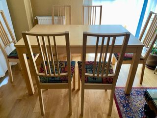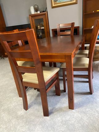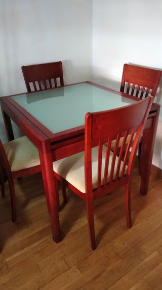 mesa extensible con 6 sillas, la mesa en cuadrada mide 90x90cm y abierta 180x90cm siempre ha tenido proteccion por lo que esta nueva y las sillas a excepcion de una que tiene mancha las demas estan bien