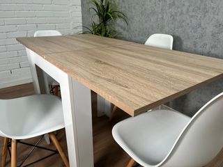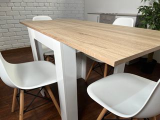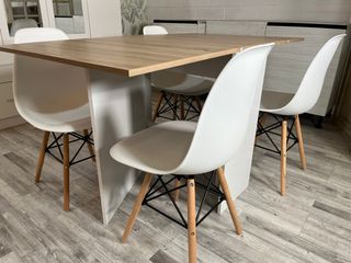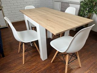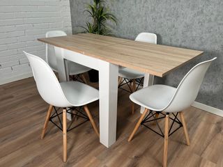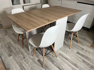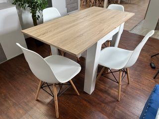 INFO: 690*638*186 - Raquel Garcia Atendemos Whatsapp Nueva mesa extensible modelo FEROE con 4 sillas nordicas, fabricada en melamina reforzada de alta calidad, bastante practida ideal para comedor o cocina Medidas: largo 67cm (cerrado) y 134 cm (abierto) x 67 cm (ancho) x 78cm (alto) - Nuevas con 2 años de garantia - Envios contra reembolso