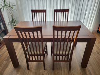 Elegante mesa de comedor de madera maciza, con un precioso veteado que le da un toque clásico y distinguido. Incluye cuatro sillas a juego. - Diseño de madera maciza. - Acabado en tonos marrones cálidos. - Conjunto de mesa y cuatro sillas. las sillas van a juego y están para encolar. la mesa es extensible 55cm por lado