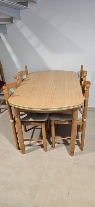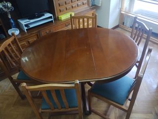 Preciosa mesa de comedor de madera con seis sillas a juego. Es perfecta para cenas familiares o reuniones con amigos. - Mesa de madera maciza. - Extensible - Seis sillas con asientos acolchados. - Diseño clásico y elegante. - En muy buen estado. - Medida abierta 1,90 MTS. Se vende también solo la mesa sin las sillas. OIGO OFERTAS