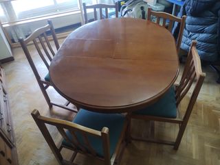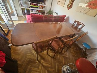 Ultimos dias. Precioso conjunto mesa de comedor extensible de madera de teka, con capacidad para seis personas cerrada. Medidas cerrada 140*90,abierta da hasta 2m. Se incluye con seis sillas de madera y banana en perfecto estado. La mesa tiene un diseño elegante y atemporal, ideal para cualquier hogar. - Estructura robusta y duradera. Alguna raya de la madera y uso que se aprecia en las fotos - Superficie lisa y fácil de limpiar. - Sillas cómodas y resistentes.
