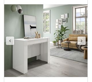 Mesa extensible con un diseño moderno y funcional. - Acabado en tonos grises. - Combinación de materiales de madera y metal. - Tiene un espacio para guardar las tablas . - 4 tablas para ampliar las medidas (cada tabla mide 86×46,5). - Se puede utilizar solo como consola (90x51x77). - 1 de las tablas tiene un roto ( se ve en fotos)