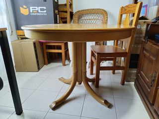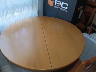 Mesa de comedor extensible, sin extender queda totalmente redonda de diámetro de 1 metro . Con 4 sillas incluidas. Está en Bastante buen estado, tiene algún arañazo y en la extensión también. Se vende por separado también.