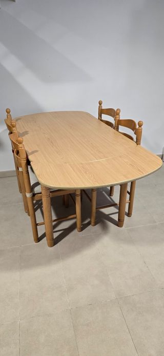 Mesa salon con un ala extensible a 189 cm de largo y 4 sillas. El tablero de la mesa esta con arañazos y algo de pintura como se ve en foto. Las sillas tienen uso y las patas estan algo sueltas. No envios