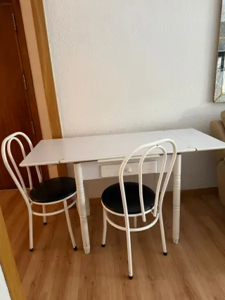 Mesa de cocina, ideal para espacios reducidos. Se encuentra en muy buen estado. - 80cm×80cm, extensible por un lado 27cm más. - Superficie blanca fácil de limpiar. - Estructura de metal color plata. Se regalan las sillas 3.