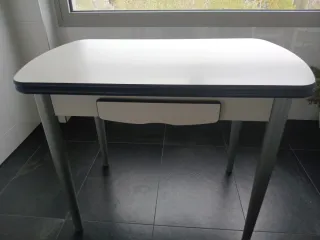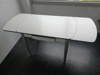 Mesa de cocina blanca con patas de aluminio. Está en buen estado y es perfecta para espacios pequeños. Se extiende para mayor comododad. - Mecanismo de extensión funcional. - Superficie lisa y fácil de limpiar. Ampliable 16350