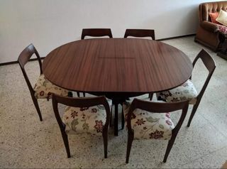 Mesa extensible de comedor antigua de madera. 6 sillas de madera. La mesa tiene marcas de uso necesitaría algo de restauración para eliminarlas. Las sillas deberian de ser limpiadas o restauradas. Los problemas son todo estéticos no afectan a su funcionamiento.