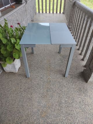 Mesa de cocina ( 1 metro x 60 cms. ) en buen estado. Su diseño moderno combina cristal y metal. - Mesa extensible hasta 1.60 cms. - Acabado superior en cristal. - Patas y estructura de metal.